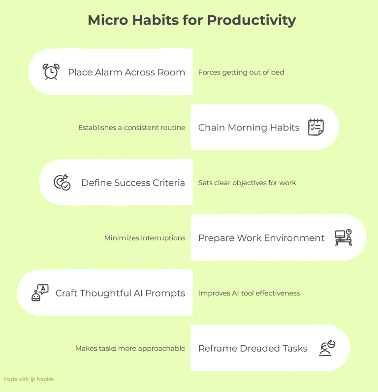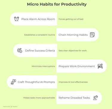 The beauty of micro habits is that they don't require radical change. Instead, they optimize your existing routines by removing small obstacles that, when accumulated, create significant inefficiency.